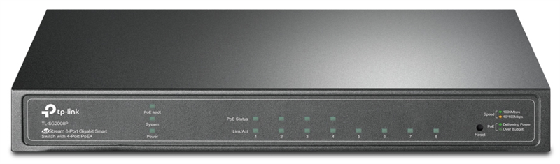 TP-Link JetStream™ 8-портовый гигабитный Smart коммутатор с 4 портами PoE+, 4 гигабитных порта PoE+, 802.3at/af, бюджет PoE — 62 Вт, стальной корпус