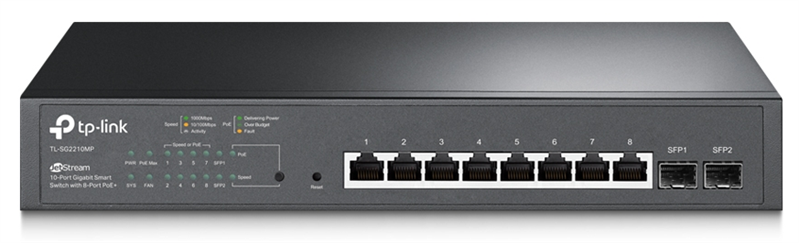 TP-Link JetStream™ 10-портовый гигабитный Smart коммутатор с 8 портами PoE+, 2 гигабитных SFP-слота, 802.3at/af, бюджет PoE — 150 Вт, стальной корпус 1U 13"