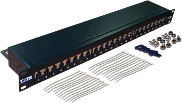 Патч-панель TWT 24 порта, STP, кат.5E, 1U. Комплект поставки: патч-панель, крепежные винты, стяжки для кабеля, инструмент для забивки проводников