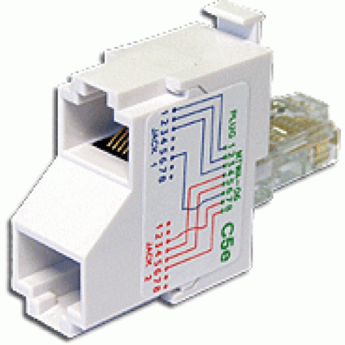 T-адаптер, 1 телефонный и 1 компьютерный порт. Преобразует один 4-парный порт RJ-45 (T568A/T568B) на входе в один 2-парный порт 10/100 BASE-T и один 2-парный порт для голосовых приложений. Схема разводки проводников размещена на боковой поверхности корпуса. T-адаптеры удобны для разделения портов на патч-панелях. Соответствует требованиям категории 5е.