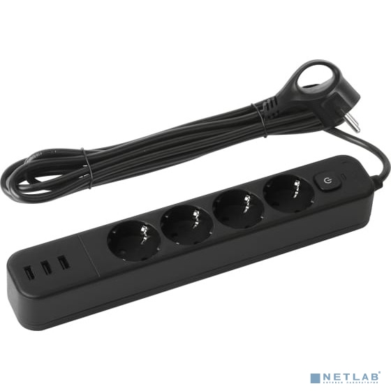 Эра Б0059568 Сетевой фильтр USF-4es-1,5m-3xUSBA-B с базовой защитой с заземлением с выключателем 4 розетки+ 3xUSBA 3,1A 1,5м 10А черный