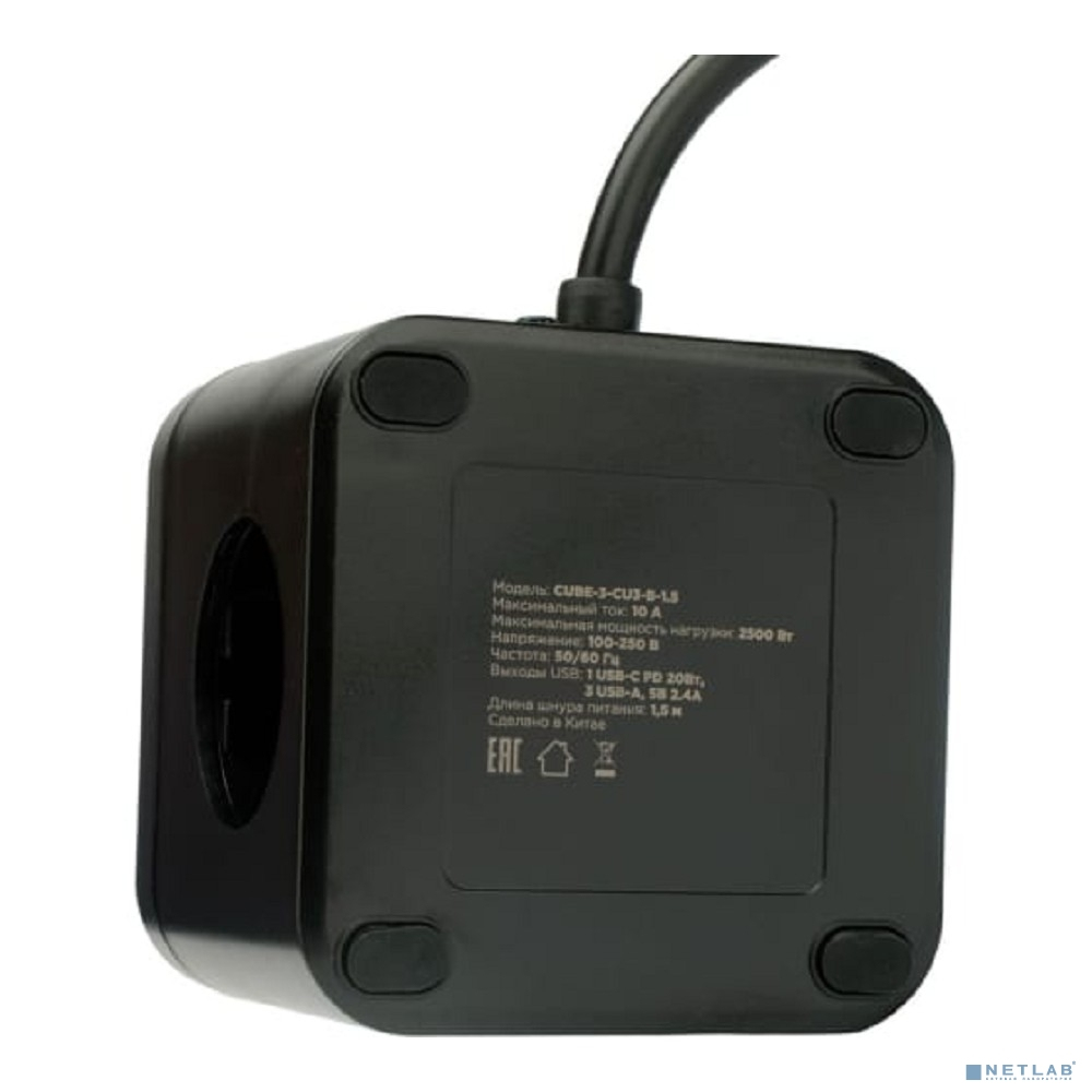 Cablexpert Сетевой фильтр Cube CUBE-3-CU3-B-1.5 (3р, 10А, 1xType-C PD, 3xUSB, 1.5м, ур.защиты 4+) черный, коробка