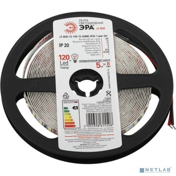 ЭРА Б0053970 Светодиодная лента LS2835 12-120-12-6500K-IP20-1 year 5м холодный белый свет 5 м