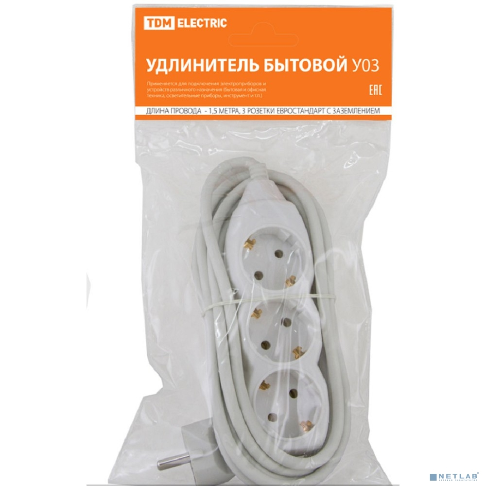 TDM SQ1303-0000 Удлинитель бытовой У03 3 гнезда, 1,5метра, с заземлением, ПВС 3х1 мм2 16А/250В