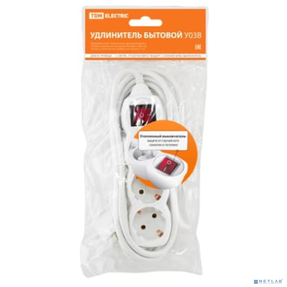 TDM SQ1303-0100 Удлинитель бытовой У03В выключатель, 3 гнезда, 1,5метра, с заземлением, ПВС 3х1 мм2 16А/250В
