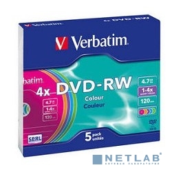 Verbatim Диск DVD-RW 4x, Colour, Slim, 5шт,(43563)