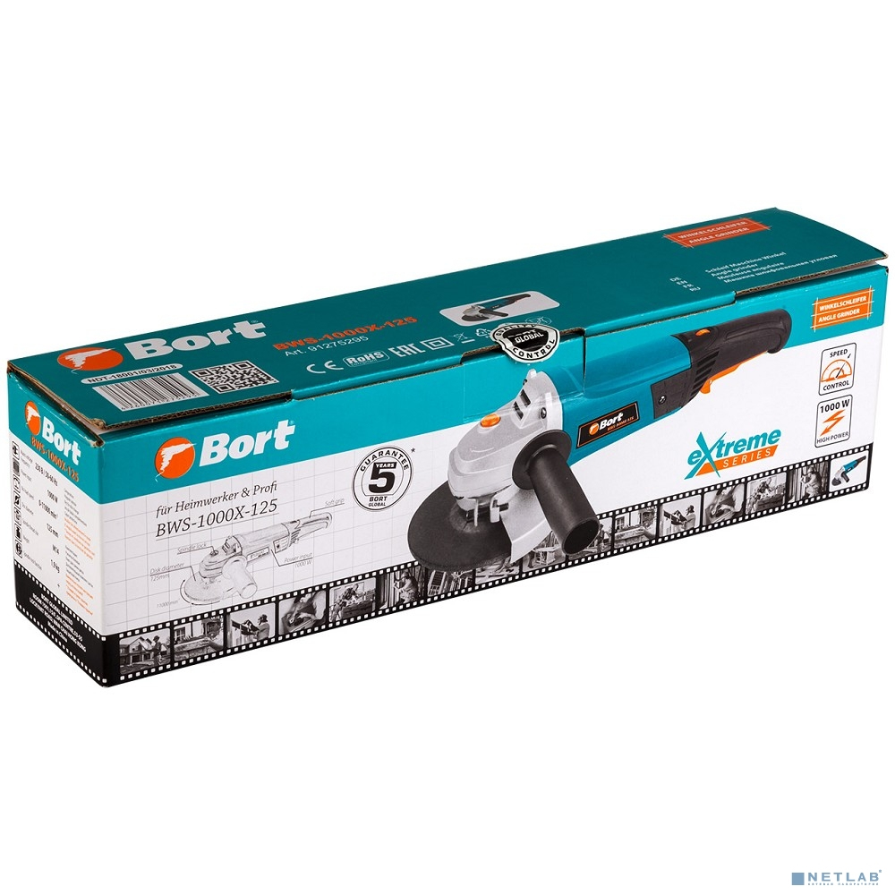 Bort BWS-1000X-125 Машина шлифовальная угловая [91275295] { 1000 Вт, 11000 об/мин, 125 мм, М14, 1,9 кг, набор аксессуаров 4 шт }