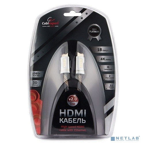 Кабель HDMI Cablexpert, серия Platinum, 1 м, v2.0, M/M, нейлоновая оплетка, позол.разъемы, металлический корпус, нейлоновая оплетка, блистер (CC-P-HDMI02-1M)