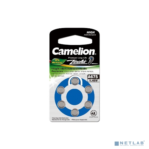 Camelion ZA675 BL-6 Mercury Free (A675-BP6(0%Hg), батарейка для слуховых аппаратов, 1.4 V,620mAh) (6 шт. в уп-ке)