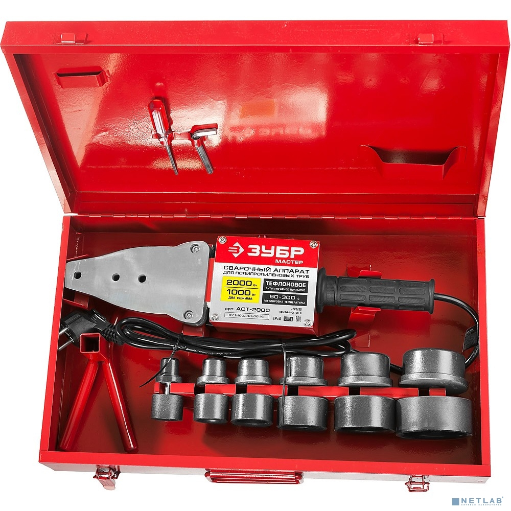 ЗУБР Мастер [АСТ-2000] Сварочный аппарат (паяльник) для полипропиленовых труб { АСТ-2000, 1000/2000Вт, 50-300С, насадки 20, 25, 32, 40, 50, 63мм, мет. кейс, 220В }