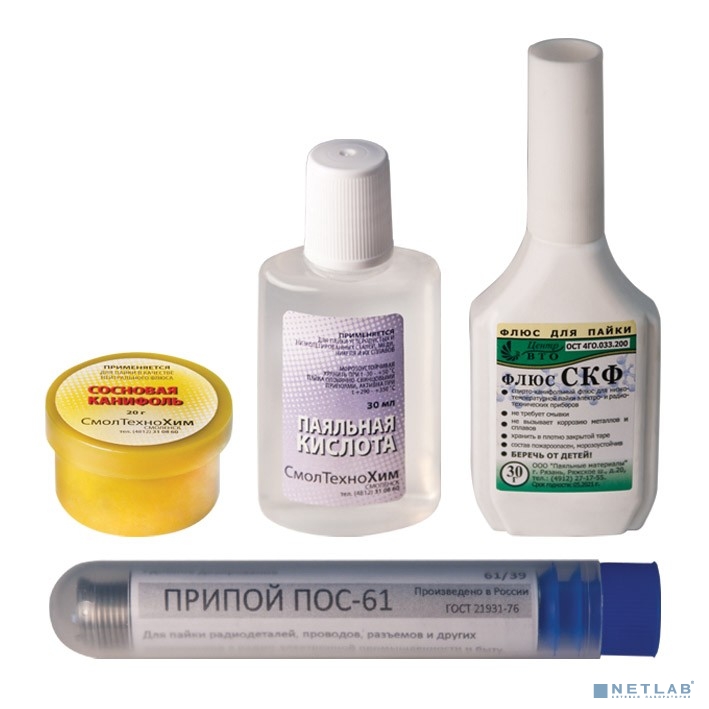 КУРС РОС Набор для пайки № 1 ( припой ПОС-61 10 гр. ; канифоль сосновая 20 гр. ; кислота паяльная 15 мл ) [60621]