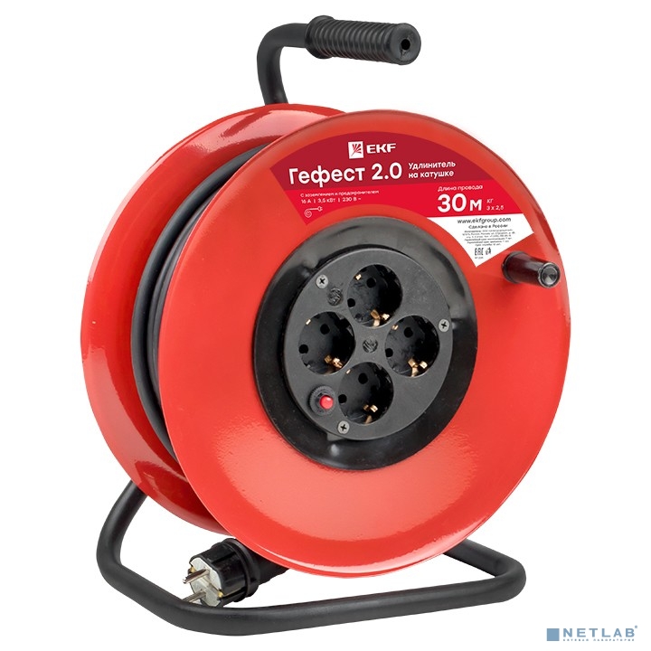 EKF UKG02-16-R325-4-30 Удлинитель на катушке "Гефест 2.0" 4 гнезда 30м с заземлением и предохранителем КГ 3*2,5 16А/3,5кВт PROxima