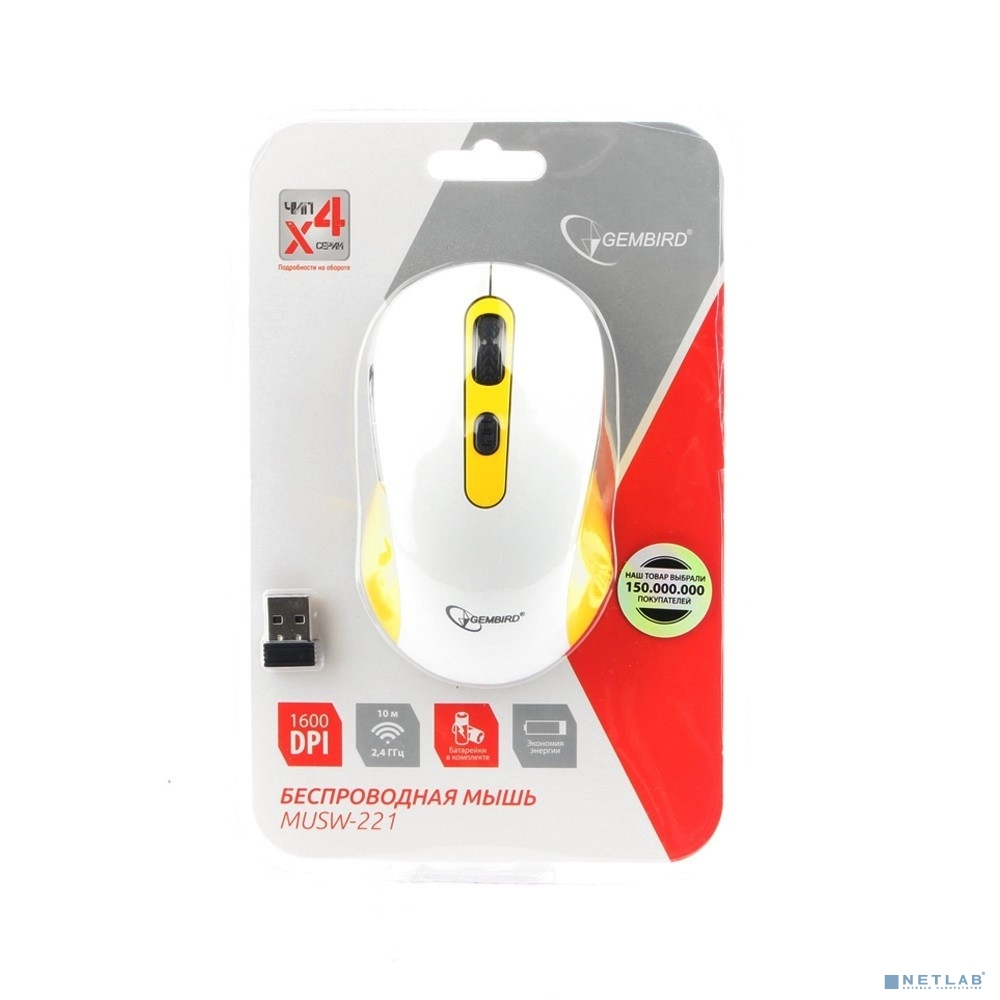 Gembird MUSW-221-Y {Мышь беспров., белый/жёлтый, 5кн.+колесо-кнопка, 800/1200/1600DPI, 2.4ГГц, трехуровневая система энергосбережения}