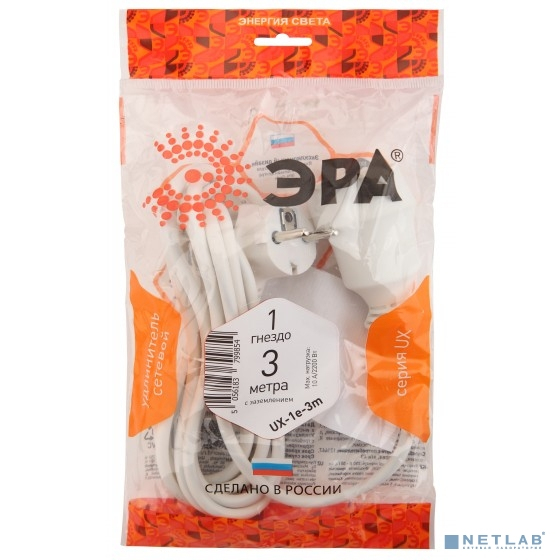 ЭРА Б0039817 Удлинитель электрический ЭРА UX-1е-3m с заземлением 1 розетка 3м ПВС 3x0,75мм2 10А