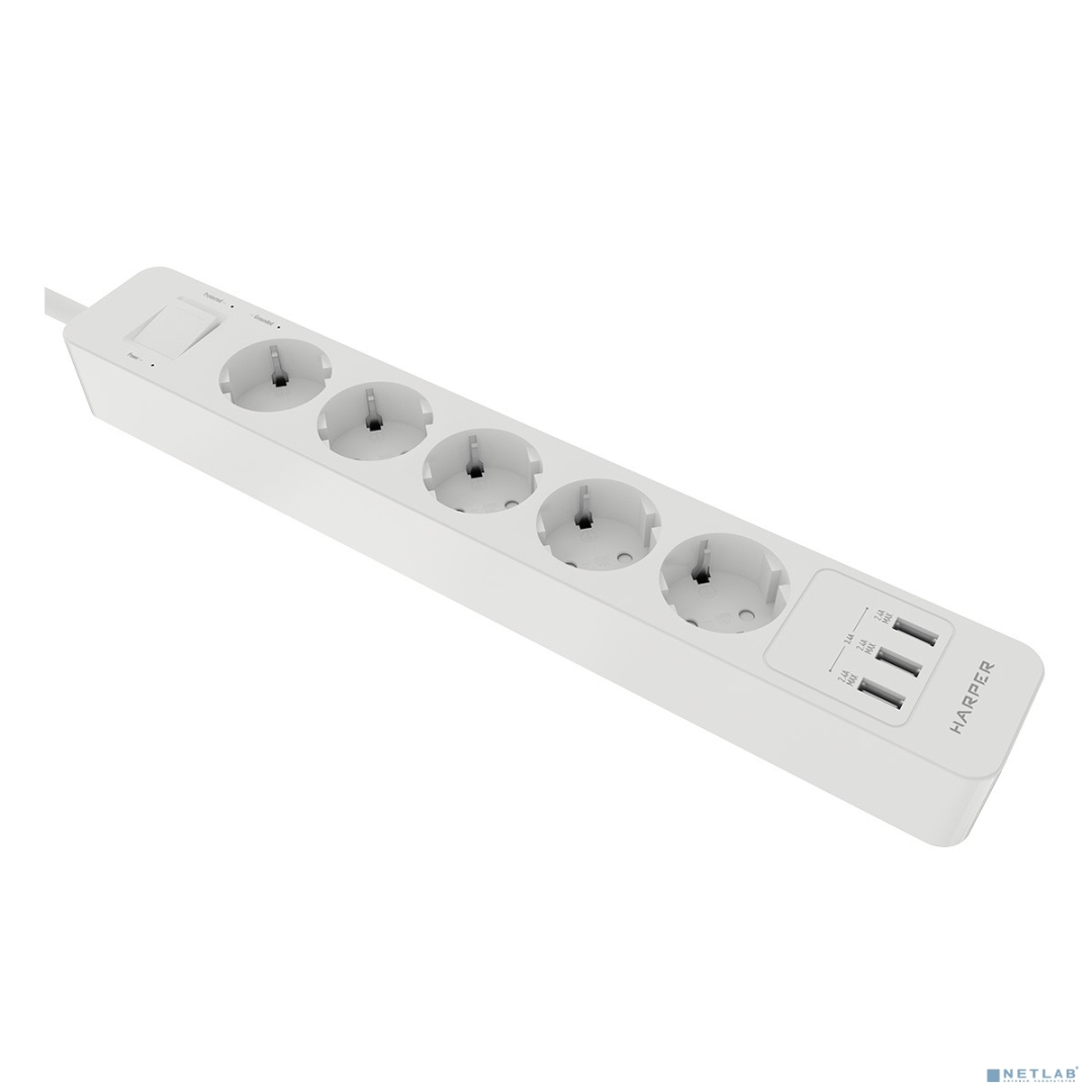 Harper Сетевой фильтр с USB зарядкой UCH-530 White (5 роз.,1,5м.,3 x USB 2.4A (max 3.4A), 4000W) {H00002264}