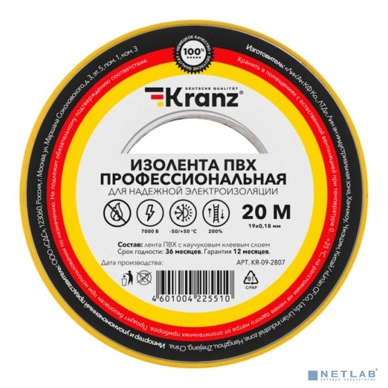 Rexant KR-09-2807 Изолента ПВХ профессиональная, 0,18х19 мм, 20 м, желто-зеленая (10 шт/уп) KRANZ