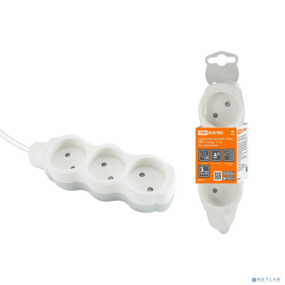 TDM SQ1303-0223 Удлинитель бытовой "Люкс" УЛ3 3 гнезда, 1,5м, б/з, с з/ш, ПВС 2х0,75 мм2 10А/250В бело-серый