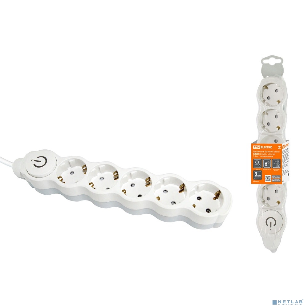 TDM SQ1303-0136 Удлинитель бытовой "Люкс" УЛ05В выкл, 5 гнезд, 1,5м, с/з, с з/ш, ПВС 3х1мм2 16А/250В бело-серый