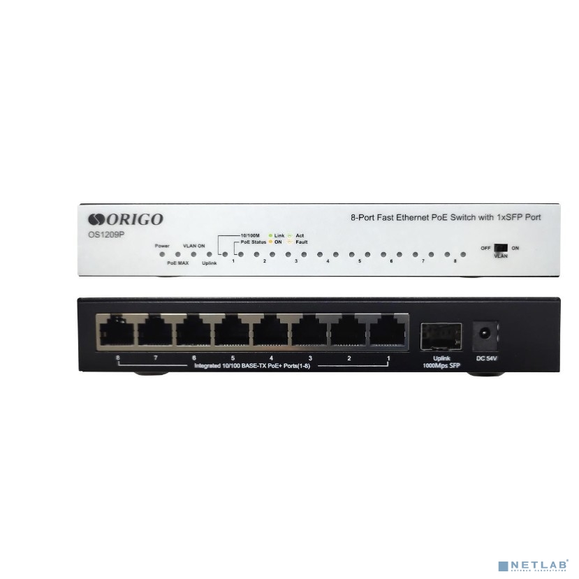 ORIGO OS1209P/A1A Неуправляемый PoE-коммутатор 8x100Base-TX PoE+, 1x1000Base-X SFP, PoE-бюджет 80 Вт, корпус металл