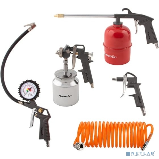MATRIX Набор пневмоинструмента, 5 предметов, быстросъемное соед., краскорасп. с нижним бачком [57302]
