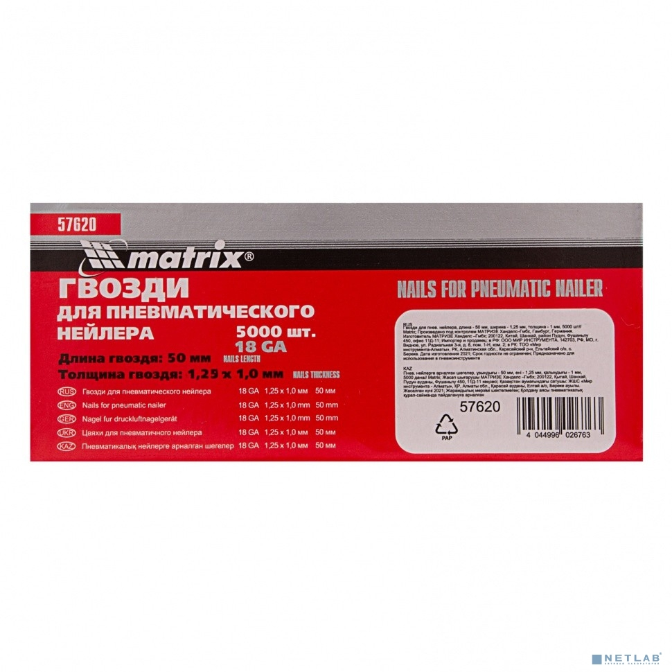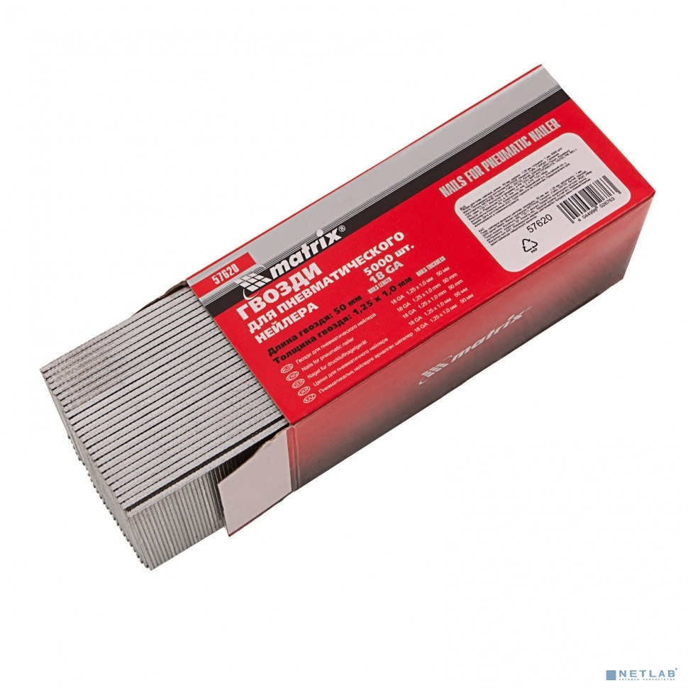 MATRIX Гвозди для пнев. нейлера, длина - 50 мм, ширина - 1,25 мм, толщина - 1 мм, 5000 шт [57620]