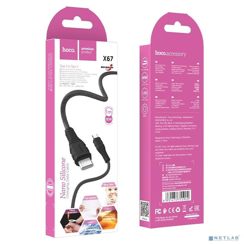 HOCO HC-55902 X67 Nano 60W/ PD кабель Type-C--Type-C/ 1m/ 60W/ Силикон/ Black