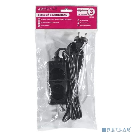 ARTSTYLE CL-C23B Сетевой удлинитель (черный, 2 гнезда, длина провода 3м, 220В, 10А, без заземления, без выключателя)