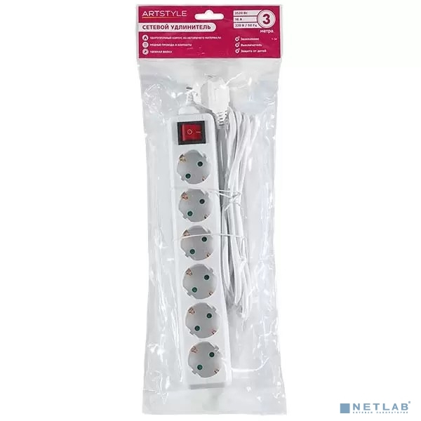 ARTSTYLE CL-C63GSW Сетевой удлинитель(белый, 6 гнезд, длина провода 3м, 220В, 16А, с заземлением, с выключателем)