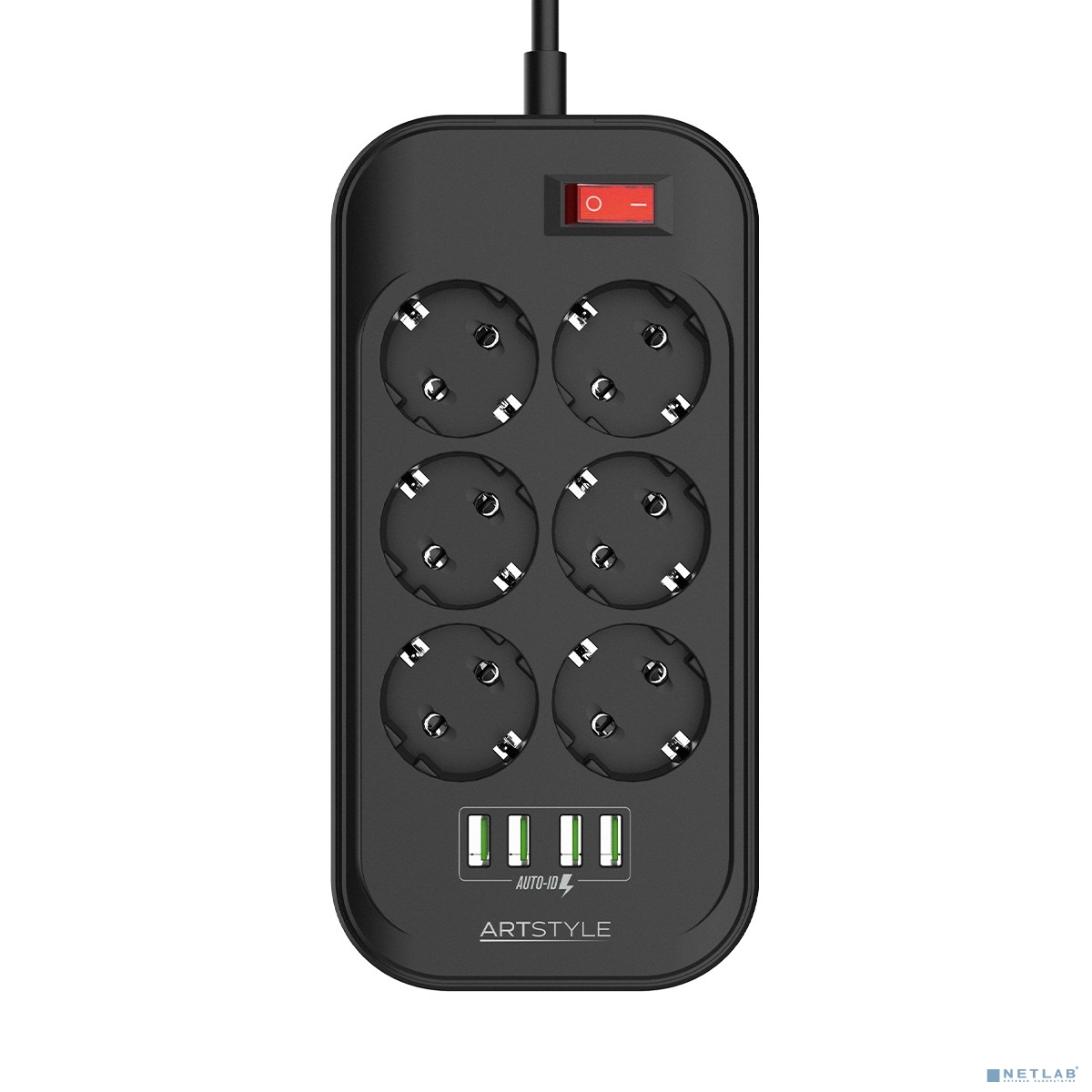 ARTSTYLE CL-6403B Сетевой фильтр,(черный, с функцией умной зарядки, 220V, 2200W, 6 гнезд, 4 usb-порта)