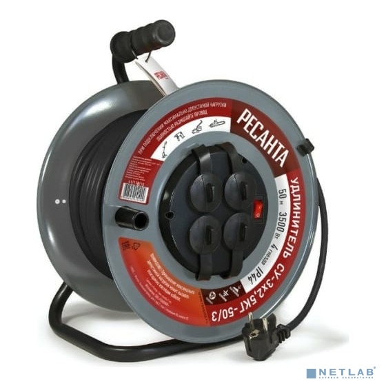 Удлинитель силовой Ресанта СУ-3х2,5КГ-50/3, розеток 4шт, 3x2.5 кв.мм, 50м, ПВС, катушка металлическая, красный [61/118/10]