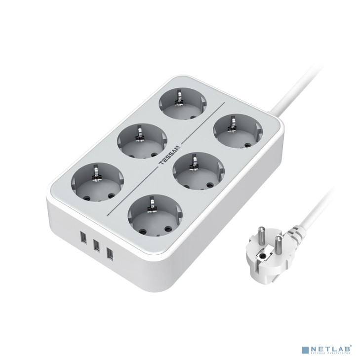 TESSAN TS-303 Grey Сетевой фильтр с 6 розетками 220В и 3 USB портами и кнопкой питания {80001846}
