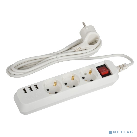 ЭРА Б0052900 Удлинитель электрический U-3es-1,5m-USB c заземлением с выключателем 3 розетки + 3xUSBA 1,5м 10А