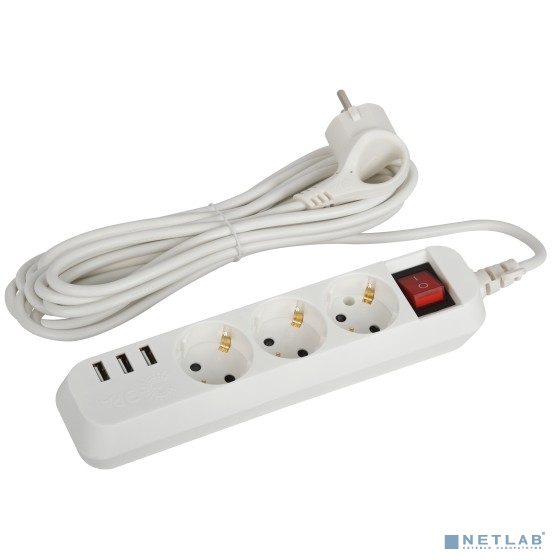 ЭРА Б0052902 Удлинитель электрический U-3es-5m-USB c заземлением с выключателем 3 розетки + 3xUSBA 5м 10А
