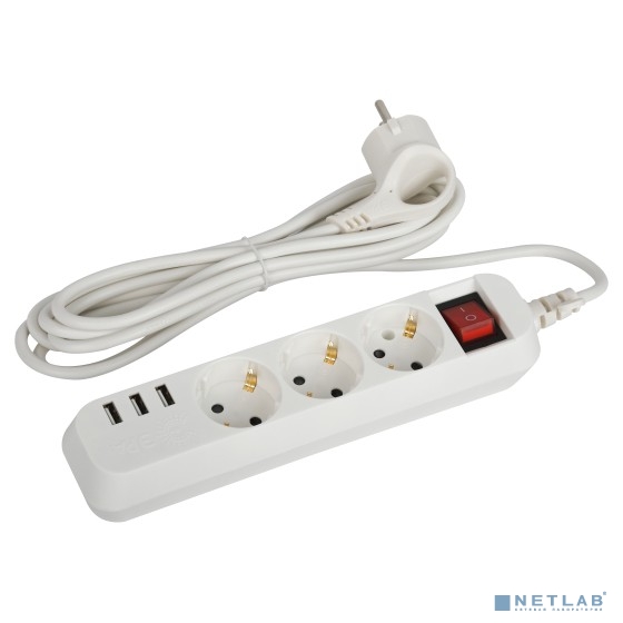 ЭРА Б0052901 Удлинитель электрический U-3es-3m-USB c заземлением с выключателем 3 розетки + 3xUSBA 3м 10А